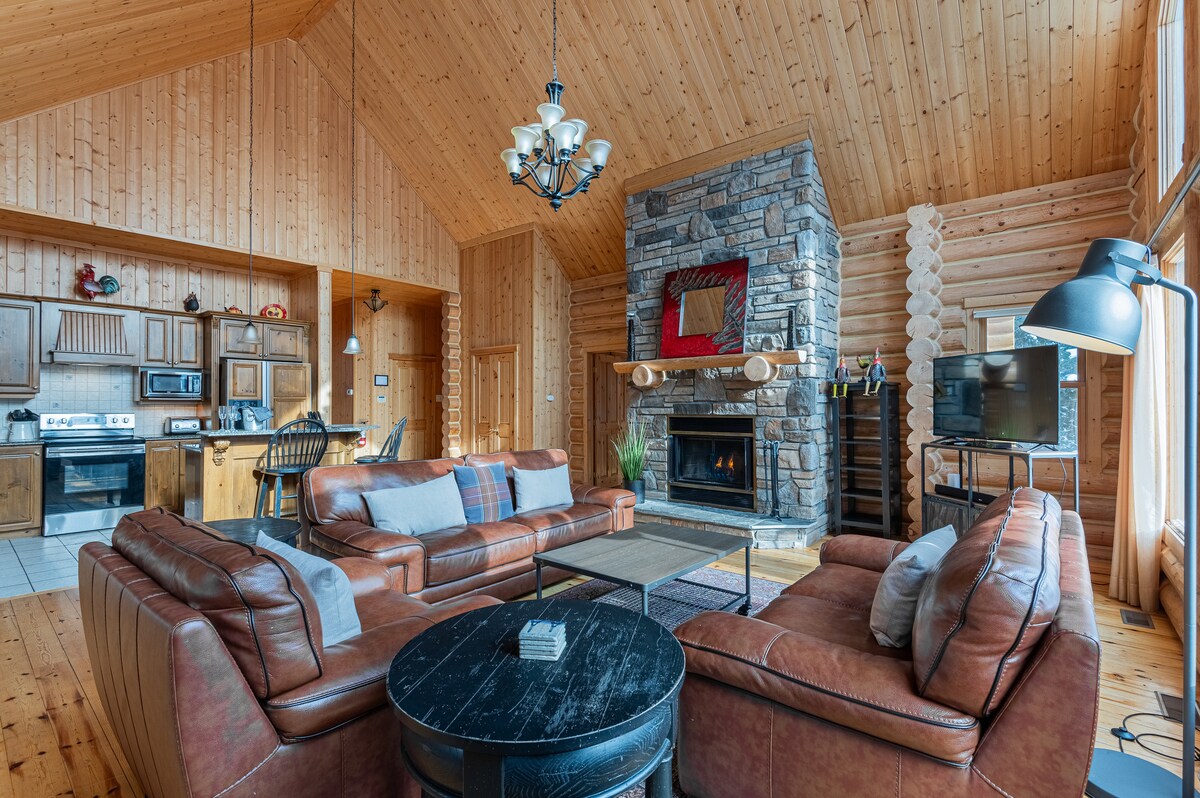 FIDDLER LAKE RESORT – DEER 41 With an outdoor above ground pool, Deer 41 guarantees a serene stay! This 4-bedroom log home can accommodate groups of up to 8 people. Deer 41 is a two-storey chalet with floor to ceiling windows, a cathedral ceiling and plenty of natural light. On the main level, there is a fully equipped kitchen, a dining area, a living room with a wood-burning stone fireplace and a bathroom. On the same floor, you'll find a master bedroom with a king bed and an en suite bathroom and a second bedroom with a queen size bed. On the lower level, there is a large living room with a wood-burning stone fireplace, a bar and pool table. There are also two additional bedrooms, each with a king bed and a bathroom. In the backyard, there is an above ground pool available from mid-June to mid-September, a private hot tub, a firepit with Adirondack chairs and a picnic table. This chalet has a covered terrace with patio furniture and a BBQ available year-round. Other amenities include a washer and dryer, satellite TV, Wi-Fi and an electric vehicle charging station. Property features: • 4 bedrooms - Bedroom 1: King bed - Bedroom 2: Queen bed - Bedroom 3: King bed - Bedroom 4: King bed • 3 bathrooms • 2 wood burning stone fireplaces • An above ground pool (available mid-June to mid-September) • A hot tub • A pool table • 2770 square feet • 8 guests maximum • * no sauna* CITQ Registration number 234721, expires: 2026-01-31